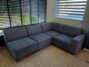 6 jaar oude bank van montel. De delen kan je uit elkaar klikken. Hij is gebruikt maar kan nog makkelijk een tijd mee. In de huidige opstelling is die 1,90 mx 2,40 m. Doordat die uit elkaar kan kan je