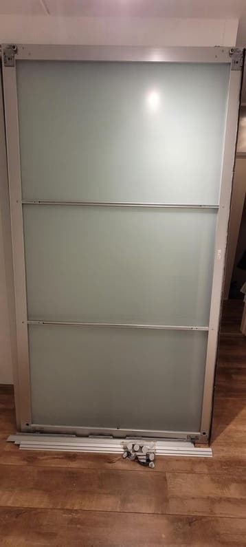 Twee ikea schuifdeuren van 1.25 Meter breed en 2.32 Meter hoog. De deuren zijn compleet met alle benodigde rails, schroeven en andere bevestigingsmaterialen, klaar voor montage. Ideaal voor een kledin
