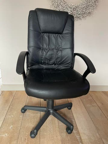 Zwarte bureaustoel, zithoogte verstelbaar. Zit goed en, op wat slijtageplekken aan de achterkant ziet de stoel er nog prima uit.