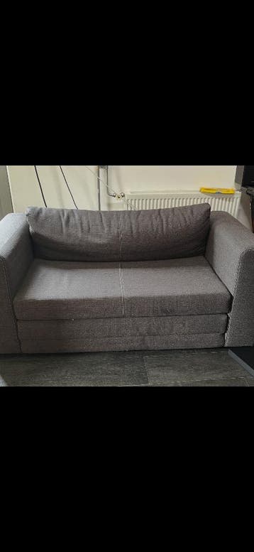 Leuke twee persoons donkergrijze slaapbank. In goede staat. Wie maak ik hier blij mee? Breedte 58 cm hoogte 62 cm diepte 27 cm ophalen in klundert