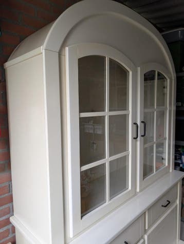 Vitrinekast die uit 2 delen bestaat: een bovenzijde met glazen deurtjes met aan de binnenzijde twee glasplaten over de volledige breedte van de kast. De onderzijde heeft twee lades en twee deurtjes, m