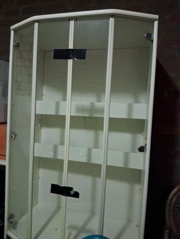 Mooie glazen vitrinekast met meerdere planken, ideaal voor het tentoonstellen van verzamelingen of decoratieve items. De kast is in goede staat en heeft een tijdloos design dat in veel interieurs past