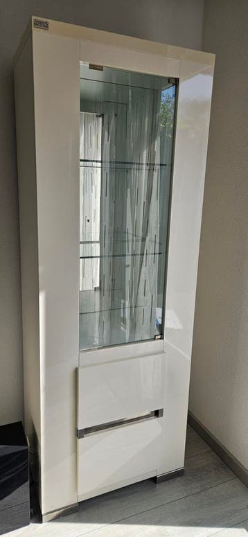Smalle hoogglans witte vitrinekast zonder beschadigingen hoogte 185cm diepte 45cm breedte 68cm we bieden ook nog een hoogglans witte salontafel gratis aan.