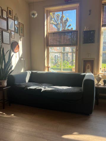 Deze veel gebruikte designbank doe ik gratis weg! De kleur is donkerblauw en louter wat vervaagt. De zitkussens bevatten donzen veren. De kussens in het rugdeel missen. Wat leuke grote kussens maken h
