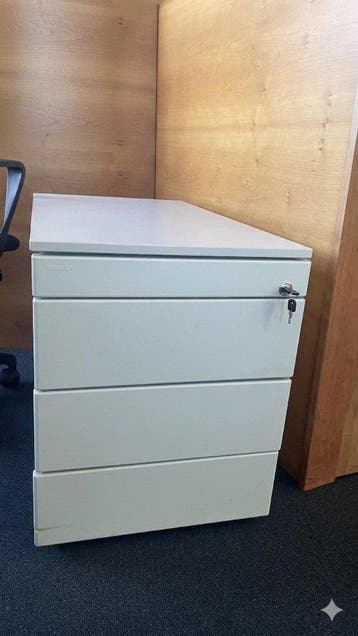 Gratis af te halen: kleine verrijdbare ladekast wegens verhuizing. Compacte lichtgrijze ladekast op wieltjes met meerdere laden en slot met sleutel. Handig voor onder of naast een bureau voor het opbe