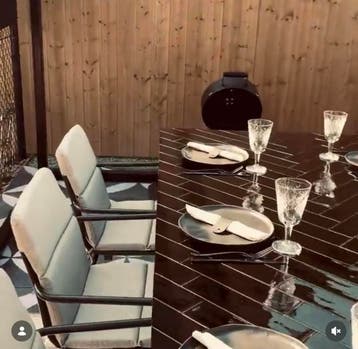 Unieke handgemaakte tuintafel met een prachtig visgraatpatroon van zwarte tegels. De tafel is stevig en heeft een glanzende afwerking die een moderne uitstraling geeft. Perfect voor buiten. De tafel i