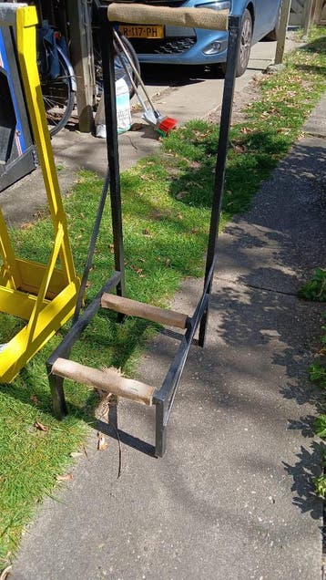 Twee zelfgemaakte contrabasstandaards voor thuis in de studieruimte.