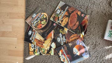 Een set van allerhande kookboeken. Het zijn verschillende boekjes met recepten voor onder andere nagerechten, vis en schaaldieren, feestelijk eten, groentegerechten en rund- en kalfsvlees. Gratis opha