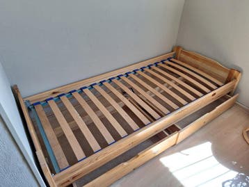 Stevig eenpersoonsbed van hout, ideaal voor een kinderkamer of logeerkamer. Het bed is voorzien van een comfortabele lattenbodem en twee handige opberglades onder het bed, perfect voor het opbergen va