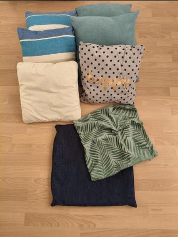 Verschillende kussentjes en 2 slopen. Kunnen nog best een ronde mee. Als set op te halen.