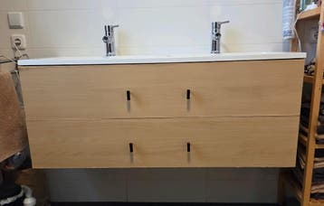 Dinsdag installeer ik een nieuw meubel en nieuwe kranen. Deze mag gratis weg. Oorspronkelijk kleur is antraciet, is gewrapped met een eiken dessin (zie laatste foto). Dit is niet overal meer mooi, maa