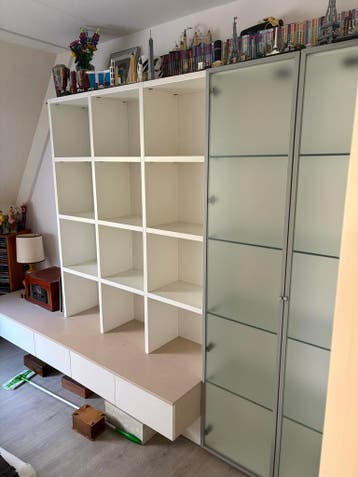 Ruime wandkast met zowel open vakken als gesloten gedeelten met deuren. Ideaal voor het opbergen van boeken, decoratie en andere spullen. De kast is in goede staat en biedt veel opbergruimte. 320 Cm b