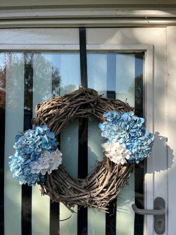 Deurkrans met hanger. Bloemen kunnen eraf, zitten met ijzerdraad vast. Maat onbekend. Gratis, alleen ophalen.