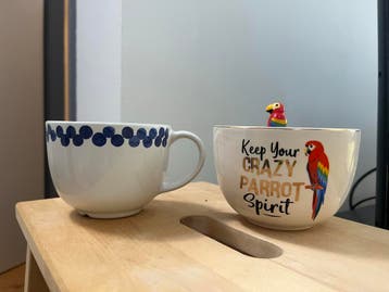 Twee mokken. Eén mok is wit met blauwe stippen, de andere kom is wit met een papegaai design. Gratis ophalen