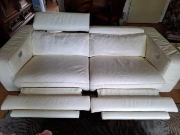 Gratis af te halen: comfortabele crèmekleurige leren bank met elektrische relaxfunctie. De bank is gebruikt en de linker hoofdsteun werkt niet meer. Zelf ophalen.
