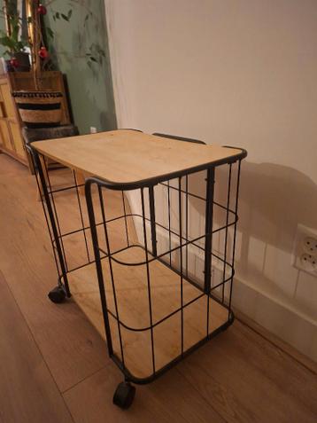 Bijzettafel met metalen look op wieltjes. Heeft gebruikerssporen maar je kan er zeker nog wat moois van maken. Ik heb er helaas ge