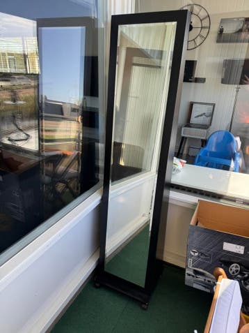 Spiegel op wielen. Moet een doekje overheen gehaald worden, maar kan nog prima een ronde mee. Op de achterkant 2 haakjes (zie laatste foto)