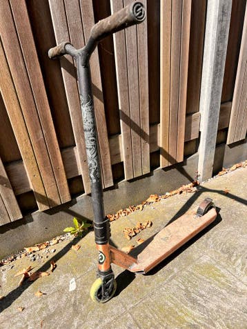 Gratis op te halen: een gebruikte stuntstep. Ideaal voor beginners of als reserveonderdeel. De step heeft duidelijke gebruikssporen, maar is nog functioneel. Perfect om te oefenen of voor wat plezier