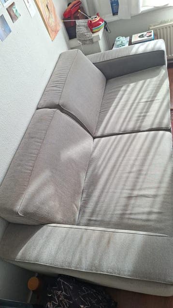 Deze comfortabele bank is in goede staat en zit heerlijk. Perfect voor een gezellige avond thuis. De bank is gemaakt van stof en heeft een rechte vorm. Ideaal voor twee tot drie personen.