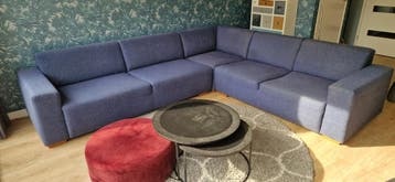 Blauwe goed zittende hoekbank. Lengte tegen de muur = 307cm. Lengte naar de woonkamer = 267cm. Hoogte inclusief leuning = 75cm. Zithoogte = 40 cm. Rughoogte = 41cm. Diepte zitvlak = 64 cm. Het vierkan