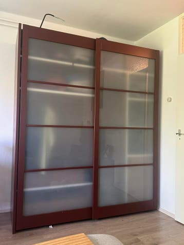 Grote kledingkast. Gaat weg omdat wij een kleiner maatje willen. Zelf bruin geverfd maar kan natuurlijk weer in een andere kleur worden geverfd. Afmetingen: 220 cm hoog 62 cm diep 187 cm breed 1 lade