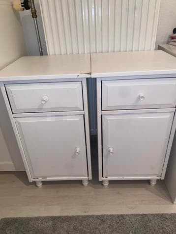 Twee nachtkastjes. Zelf geverfd sommige stukken is het verf van af. Schuren en verven en zie je niet veel van. Stevige houten nachtkastjes met 1 lade en deurtje met een plank erin. Mag weg samen voor