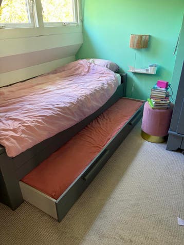 Gratis op te halen in tilburg: een eenpersoonsbed en een bijpassende kledingkast, beide van hout en grijs geverfd. Het bed heeft een uitschuifbaar gedeelte eronder, ideaal voor logees of extra opbergr