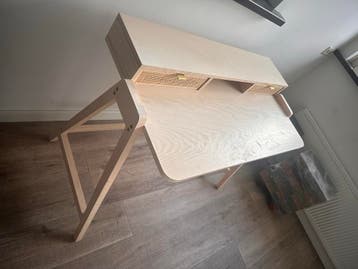 Mooi bureau met een handig opzetstuk en twee lades. Het blad heeft wat gebruikssporen en mag opgeknapt worden, maar het bureau is verder in goede staat. Ideaal voor een studeerkamer of thuiskantoor. A