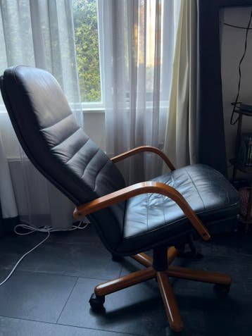 Zwarte leren bureaustoel, waarvan stoel gedeelte recentelijk is losgekomen (zie laatste foto). Gratis op te halen, wie weet kan het nog gemaakt worden, voor de rest was het nog een goede stoel