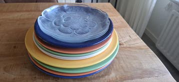 Deze set bestaat uit 7 vrolijke borden in diverse kleuren, 2 witte met opdruk en 2 glazen borden, perfect voor elke maaltijd. De borden zijn gemaakt van aardewerk en verkeren in goede staat. Bovenop d