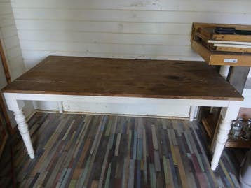 Mooie, stevige eettafel met een lengte van 184 cm, diepte van 90,5 cm en hoogte van 78,5 cm. Het houten blad heeft wat liefde nodig en kan eventueel geschuurd worden voor een frisse look. De witte pot