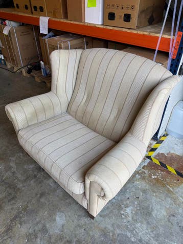 Deze zeer mooie kwaliteit 1,5-zits stoel is gratis af te halen. De stoel heeft een grondige reiniging nodig, maar is verder in goede staat en biedt comfortabele zitruimte.