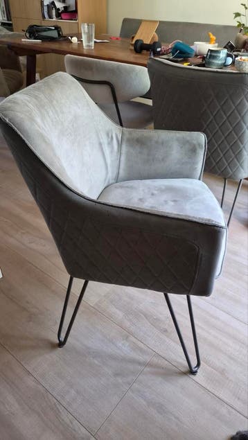 Comfortabele grijze eetkamerstoel met een modern design. De stoel heeft een zachte stoffen bekleding en stevige metalen hairpin poten. Let op: de stoel heeft duidelijke gebruikssporen, waaronder slijt