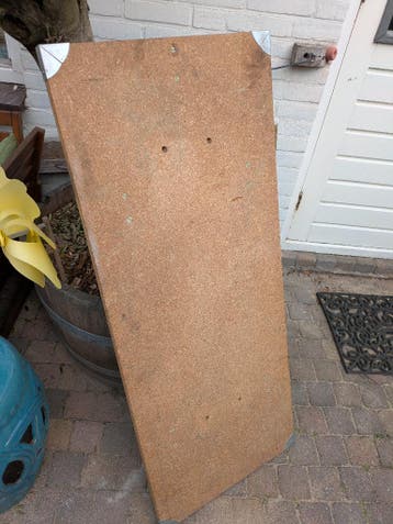 Een tafel met opklapbare poten. Het blad is van een soort geperst hout. Er zitten vier gaten in geboord. Hij is zwaarder dan hij lijkt, ik schat ongeveer 20 kilo. Het blad is ongeveer 40 x 120 cm. Af