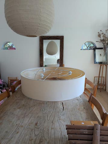 Grote, ronde lampenkap, ideaal voor boven een eettafel. De lampenkap heeft een hoogte van 25 cm en een doorsnede van 100 cm. Gratis af te halen.