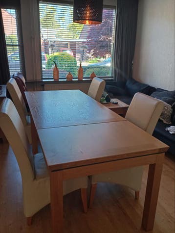 Gratis af te halen! Mooie uitschuifbare eettafel, ideaal voor zowel dagelijks gebruik als voor grotere gezelschappen. De tafel is in goede staat en biedt flexibiliteit in ruimte. Let op: de stoelen zi