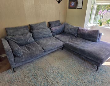 Heerlijke relax bank. Bank is constructief nog in orde, bekleding is wel een beetje verkleurd. Kleur: petrol blauw. Zwarte metalen pootjes. De bank bestaat uit twee delen. Linkerdeel: 100 diep, 170 br
