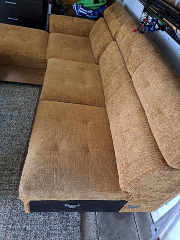 Hoekbank. Een groot gedeelte ervan. Zeer netjes. Okergeel. Gratis. Met 1 klein op kijk plek. Zie foto.ssss