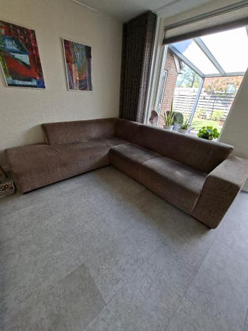 Hoekbank van stof, komt uit een rookvrij en diervrij huis. Afmeting 270 x 230. Diepte 85cm. Zitdiepte 62 cm moet weg ivm ruimtegebrek. Gratis af te halen