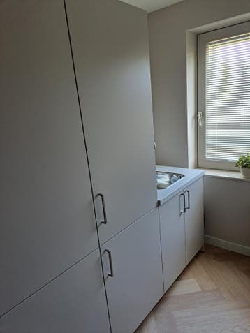 1 keukenkastdeur 60x200 cm kleur: taupe. Helemaal aan de onderzijde licht beschadigd.