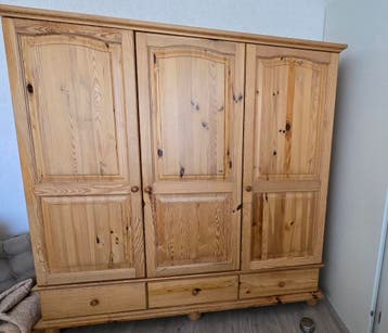 Grenen kast, gratis afhalen 2 delen hang, 1 deel legplanken. 3 Lades aan onderkant breed 185 cm hoog 185 cm diep