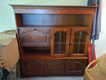 Mooie gebruikte buffetkast met ingebouwde verlichting. Ideaal voor het opbergen van servies of decoratie. De kast heeft diverse opbergmogelijkheden, waaronder dichte deuren en deuren met glas. De verl