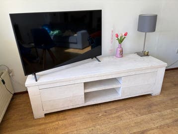 Wit tv-meubel, ideaal voor de woonkamer. Het meubel heeft twee open vakken en twee kasten met deuren, wat zorgt voor voldoende opbergruimte voor al uw media-apparatuur en andere spullen. Het meubel is