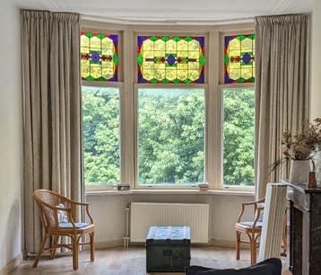 4 stevige gordijnen in een lichte crème/beige kleur met blad/bloem motief. Afmetingen (ong.): 280 Cm lang, 165 cm breed kenmerken: zware kwaliteit stof, verduisterend, gebruikte staat gaan weg wegens