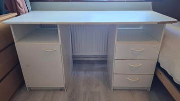 Veelgebruikt wit bureau met een kastje aan de linkerkant en drie lades aan de rechterkant. Beschadigingen te zien op de foto's. Aan de rechterkant van het blad is er een stukje van gezaagd zoals t