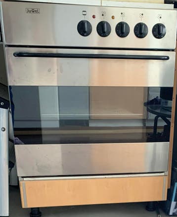 Deze juwel elektrische inbouwoven was direct op stroom aangesloten. Er moet zelf een stekker aan worden gezet. De oven kan gekoppeld worden aan een kookplaat.