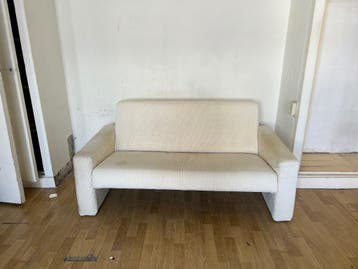 Wit tweepersoons bankje, veel gebruikt. Vlek op zitvlak en kleine vlekjes hier en daar. Met wasbare hoes. Foto’s met en zonder hoes. Mag gratis weg, donatie is welkom. Ophalen uiterlijk 30 april 4e et