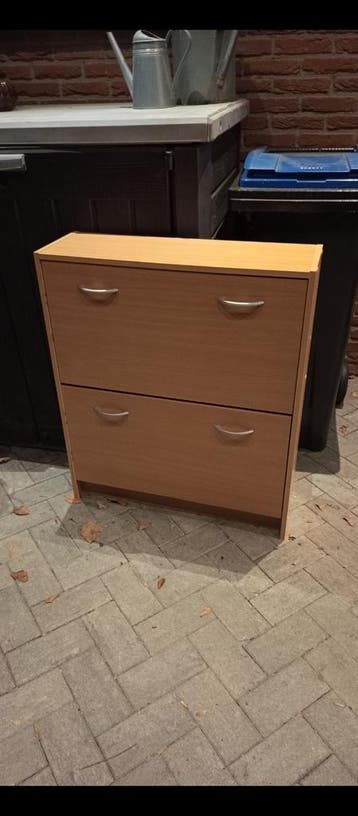 Praktische schoenenkast in een lichte houtkleur met twee handige lades. Ideaal voor het opbergen van schoenen in de hal of slaapkamer. De kast is gebruikt, maar nog in goede staat en functioneert naar