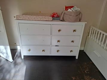 Mooi wit ladekastje met zes ruime lades, ideaal voor een kinderkamer of als extra opbergruimte. Het kastje is gebruikt en er zitten wat gebruikers sporen op, maar kan nog prima een ronde mee. De knopp