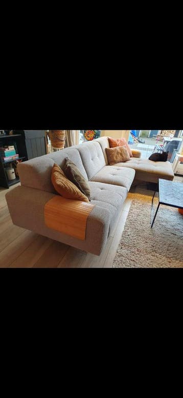 Deze stijlvolle hoekbank is 6 jaar oud en heeft helaas flinke gebruikerssporen van onze katten. Het is een hele mooie bank, met zwarte poten en lichtgrijze stof maar doordat onze katten er graag aan k